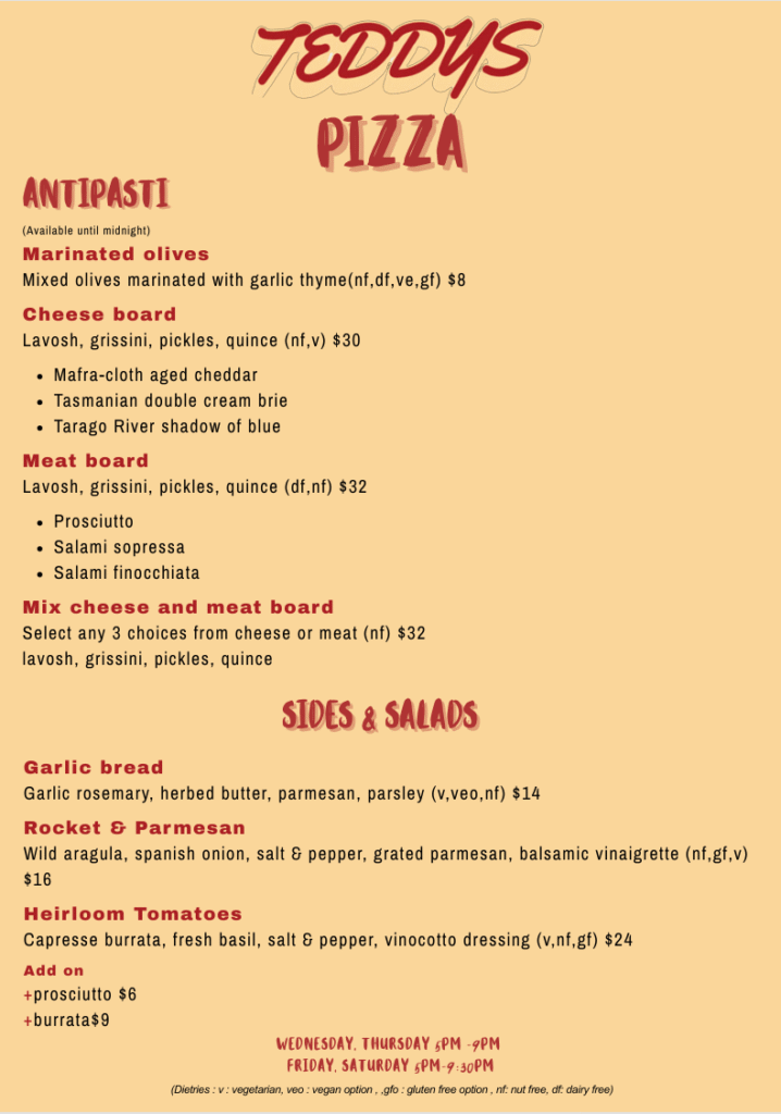 Teddy's Pizza Menu